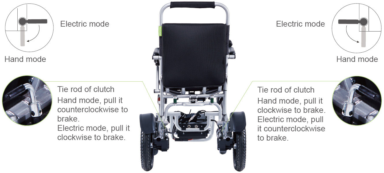 Pull the tie rod to the open position, then the brake of H3S will not work, the weelchair can be pushed by people(no matter the H3S is power on or power off, people can do it), when people pulf the tie rod to the close position, nobody can push the H3S.